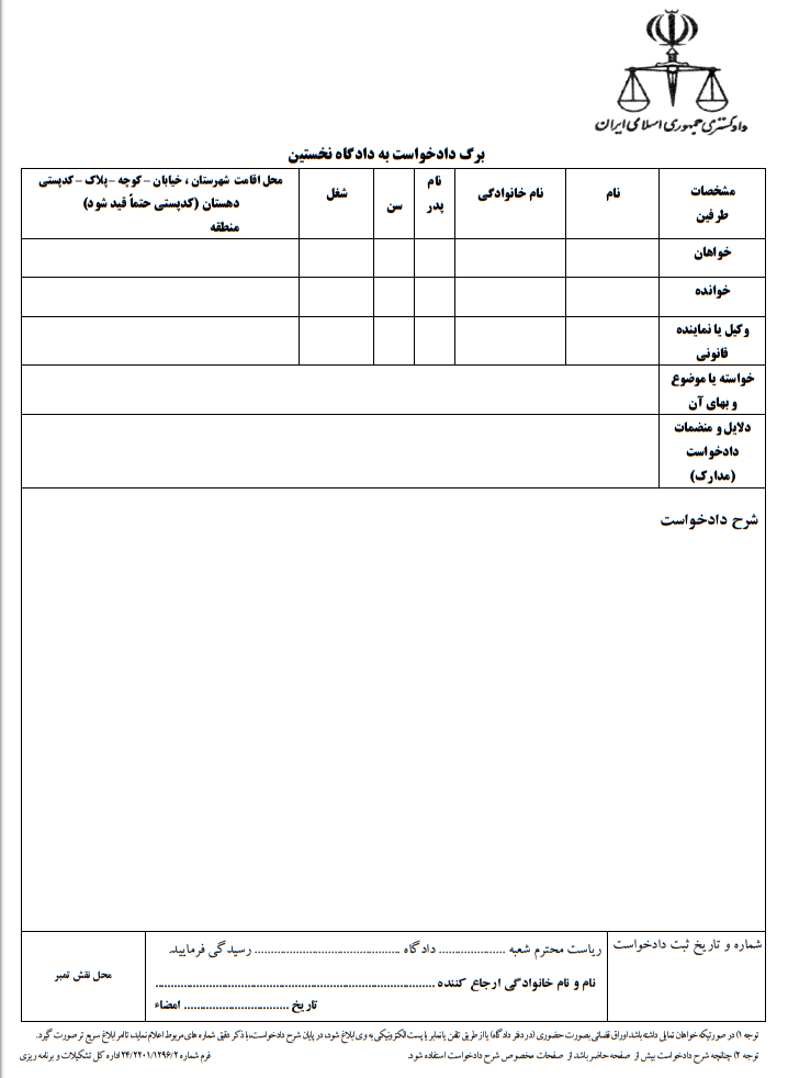 دانلود نمونه فرم دادخواست برای ارائه به دادگاه نخستین